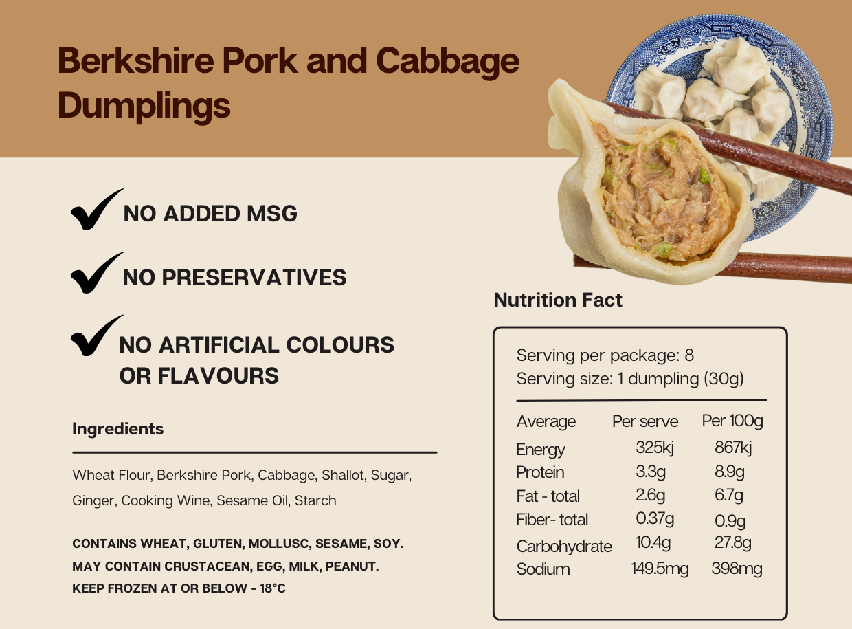 Handmade and pan-ready, our Pork Gyoza are filled with juicy local pork, delicately seasoned with ginger, sesame oil, soy sauce, and a touch of oyster sauce and white pepper. Wrapped in thin wheat pastry, each gyoza offers a savoury bite with a golden, crispy finish when pan-fried.