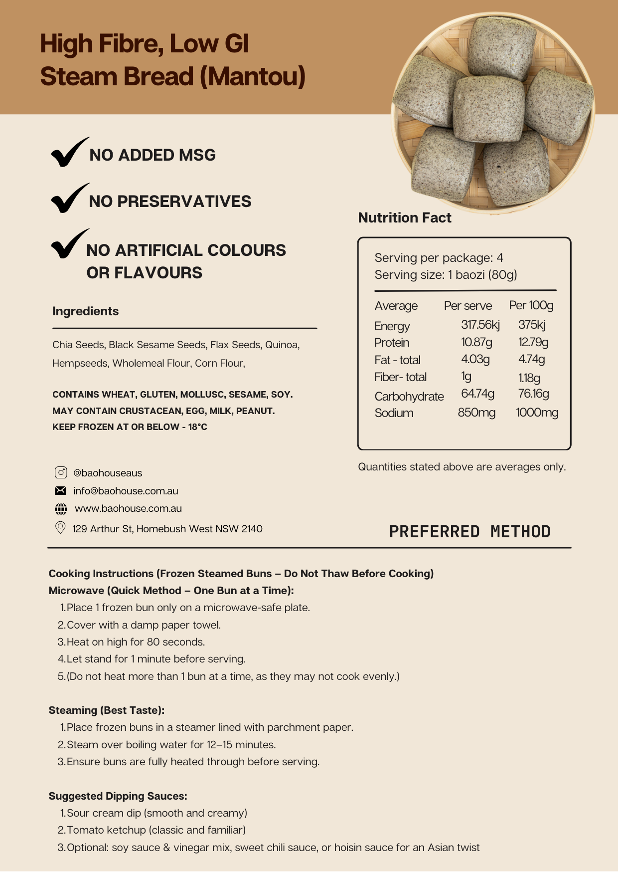 Handmade steamed bread crafted with a wholesome blend of chia seeds, black sesame, flax seeds, quinoa, hempseeds, wholemeal flour, and corn flour. Soft, fluffy, and frozen fresh with no added MSG, preservatives, or artificial colours.